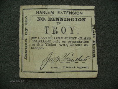HARLEM EXTENSION RAILROAD TICKET NORTH BENNINGTON TO TROY
