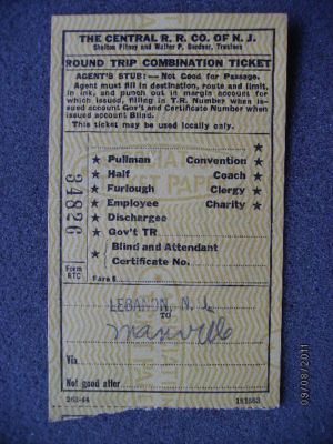 CENTRAL RAILROAD OF NEW JERSEY 1952 TICKET AGENT STUB LEBANON TO MANVILLE
