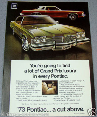 1973 PONTIAC GRAND PRIX HARDTOP PARISIENNE BROUGHAM 4 DOOR HARDTOP CAR CANADA AD