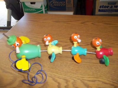 MOTHER DUCK AND BABY DUCKS WOODEN PULL TOY 1960's