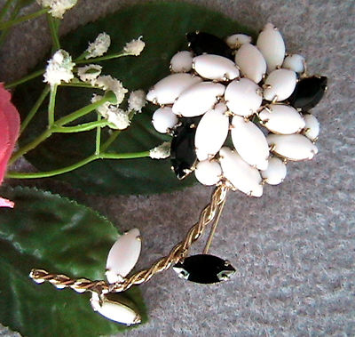 Huge Vintage Milk Glass & Black Rhinestone Brooch