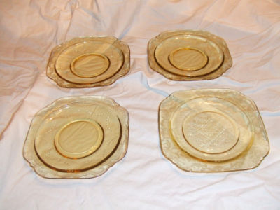 4 SAUCERS AMBER DEPRESSION GLASS MADRID