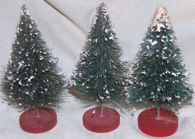 Title (ebay affiliate link): 3 Vintage BOTTLE BRUSH 6 inch Christmas TREES Red WOOD BASE Mica Snow OLD