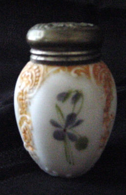Title (ebay affiliate link): MT. WASHINGTON ANTIQUE HAND PAINTED MILK GLASS SHAKER/HATPIN HOLDER
