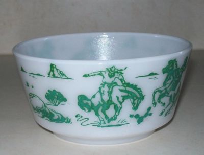 Title (ebay affiliate link): HARD TO FIND HAZEL ATLAS GREEN COWBOY BOWL - WHITE MILKGLASS CHILDS BOWL