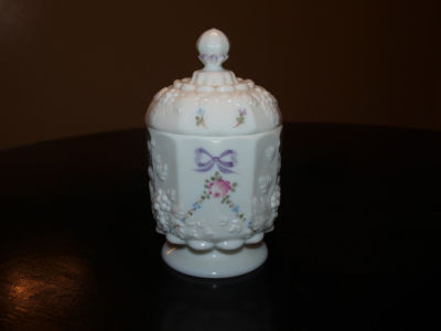 Westmoreland milk glass ROSES & BOWS CANDY DISH with LID (hand painted )