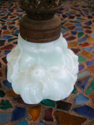 Title (ebay affiliate link): VINTAGE MINIATURE KEROSENE LAMP WITH FLOWER MOLDED MILK GLASS,SWIRLED GLS.SHADE