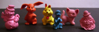 6 vintage Diener Erasers: snowman, rabbit, chipmunk, poodle, kitty, clown