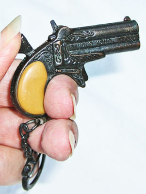Title (ebay affiliate link): Vintage Metal Derringer Gun Key Chain Hammer Cocks Trigger works