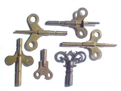 Title (ebay affiliate link): 6 ORIGINAL ANTIQUE BRASS & STEEL CLOCK WINDING KEYS--SETH THOMAS, ANSONIA--N/R