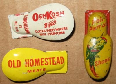 3 Old Tin ADVERTISING CLICKERS Poll Parrot Meat OshKosh