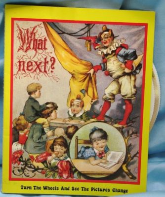 Title (ebay affiliate link): WHAT NEXT? Reprint Children's Antique Moveable Parts Book - Turn the Wheels