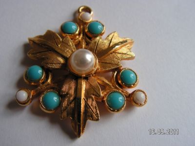 Title (ebay affiliate link): VINTAGE GOLD TONE PEARL TURQUOISE AND MILK GLASS STONE PENDANT SIGNED