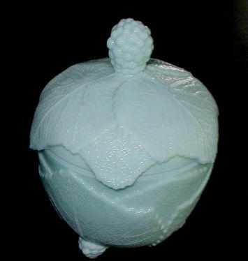 Title (ebay affiliate link): Vintage Blue Milk Glass Berry & Leaf Covered Candy Berry Feet & Finial Excellent