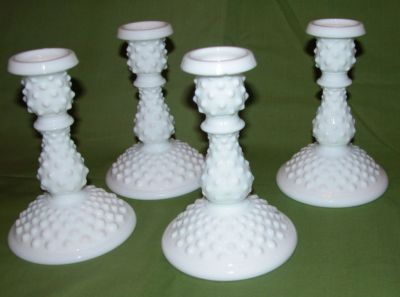 4 VINTAGE WHITE MILK GLASS HOBNAIL CANDLE HOLDERS - NR
