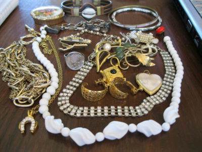 Title (ebay affiliate link): VINTAGE JEWELRY LOT JADE MILK GLASS COPPER RHINESTONE AND MORE GREAT LOOK
