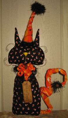 Title (ebay affiliate link): foLk Art PrimiTive HaLLoWeeN Candy Corn Black WiTch Whimsy tall Trick CaT Doll
