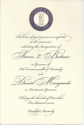 Historical Official 2007 Kentucky Governor Steve Beshear Inauguaration Invite