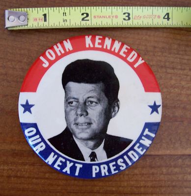 JOHN KENNEDY JFK CAMPAIGN BUTTON, LARGE PIN, 3 1/2 INCHES