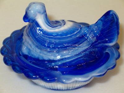 COBALT MILK SLAG GLASS HEN CHICKEN ON NEST BASKET DISH