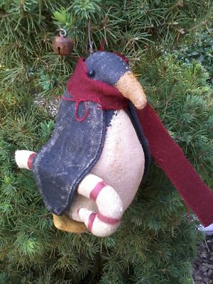 PRIMITIVE~PENQUIN CHRISTMAS ORNAMENT W/SCARF & JINGLE BELL HANGER~NEW~