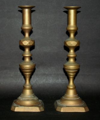Large Antique 19th C Brass Push Up Candlesticks. Pair.
