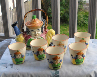 Title (ebay affiliate link): Antique Figural Oriental Japan Wicker Handle Teapot Tea Pot SET & Cups Service