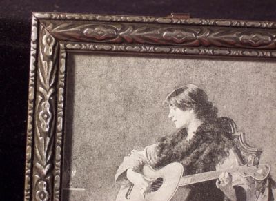 Title (ebay affiliate link): ANTIQUE ART DECO CARVED SILVER GILT WOOD FRAME w/ OLD PRINT GIRL & GUITAR