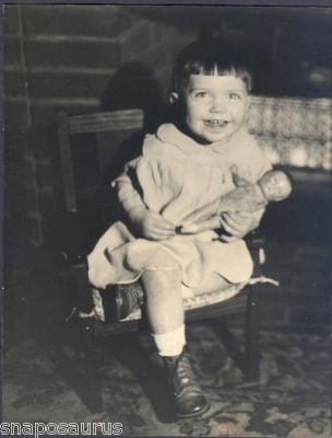 Title (ebay affiliate link): Smiling Toddler GIRL on CHAIR clean dress w dirty DOLL old Antique PHOTO