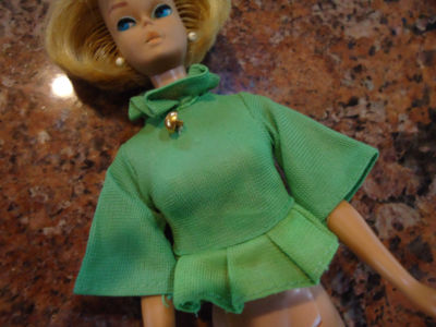 Title (ebay affiliate link): VINTAGE BARBIE (50's - 60's) GREEN RUFFLE NECK & WAIST GOLD BUTTON PAPER TAG