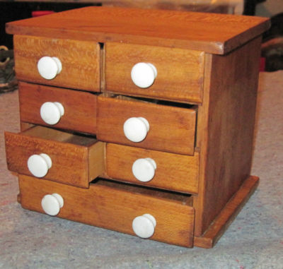 Title (ebay affiliate link): antique miniature chest of drawers, porcelain knobs, light wood