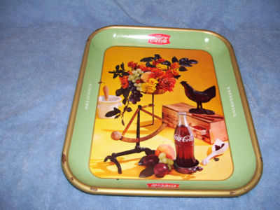 Title (ebay affiliate link): 1957 Coca Cola Serving Tray Toleware Rooster Flowers Fruit Mortar Bowl Antiques