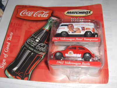 Title (ebay affiliate link): MatchBox Toy Coca Cola 1967 Volkswagon Bus Panel Transporter & 1962 VW Beetle