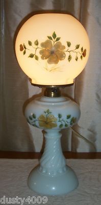 Title (ebay affiliate link): ANTIQUE MILK GLASS OIL LAMP CONVERTED TO ELECTRIC 17" TALL HAND PAINTED