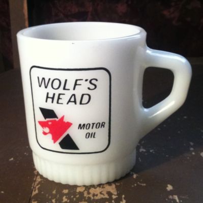 Title (ebay affiliate link): Rare Vtg Fire King Wolf Head Motor Oil Auto Advertisment Milk Glass Mug Cup 051