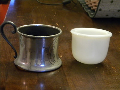 ANTIQUE SHAVING CUP mug coffee milk glass metal liner D