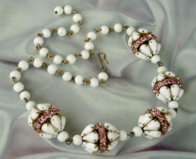 OUTSTANDING VINTAGE RHINESTONE & MILK GLASS BALLS NECKLACE ~ RARE DESIGN