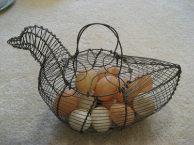 Title (ebay affiliate link): VINTAGE PRIMITAVE WIRE CHICKEN EGG BASKET WITH 17 EGGS.