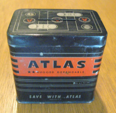 Vintage 1950's Tin Litho Toy Bank, Atlas Battery, Automobilia