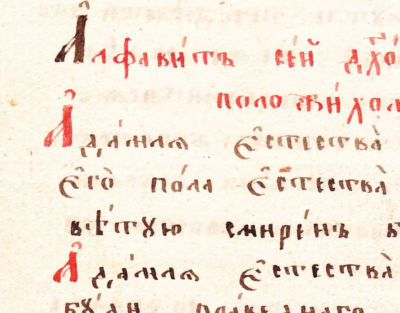 Title (ebay affiliate link): 4 Leaves Russian Orthodox Old Church Slavonic Red Manuscript Bible with Red Ink