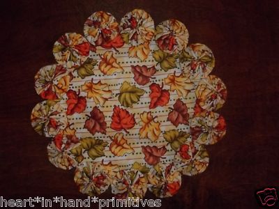 Title (ebay affiliate link): Prim Autumn Fall Falling Leaves Yo Yo Candle Mat Penny Rug Handmade Bowl Filler