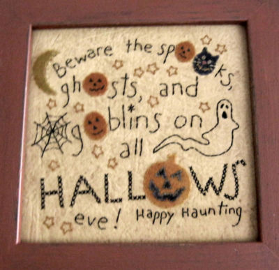 Title (ebay affiliate link): Primitive Halloween Penny Rug Stitchery - Framed - Cat Jack Ghost - Sgnd Sampler