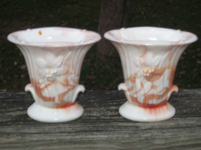 Title (ebay affiliate link): 2 Antique Vintage Akro Agate White Orange Slag Glass Vases Marked