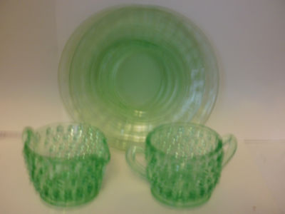 Title (ebay affiliate link): Green Depression Glass Hobnail Creamer & Sugar Set and 3 Square Pattern Dishes