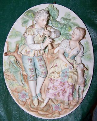 Title (ebay affiliate link): Antique Oval Bisque Porcelain 3 - D wall Plaque Figurine Man Horn Woman Lamb