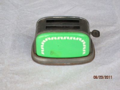 Title (ebay affiliate link): VINTAGE VERY SMALL GREEN TIN TOASTER- 4 3/4 BY 3 1/8 INCHES
