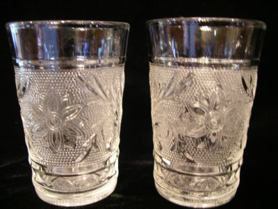 Title (ebay affiliate link): 2 VINTAGE INDIANA SANDWICH GLASS JUICE GLASSES,DEPRESSION,CLEAR,FLOWER DESIGN