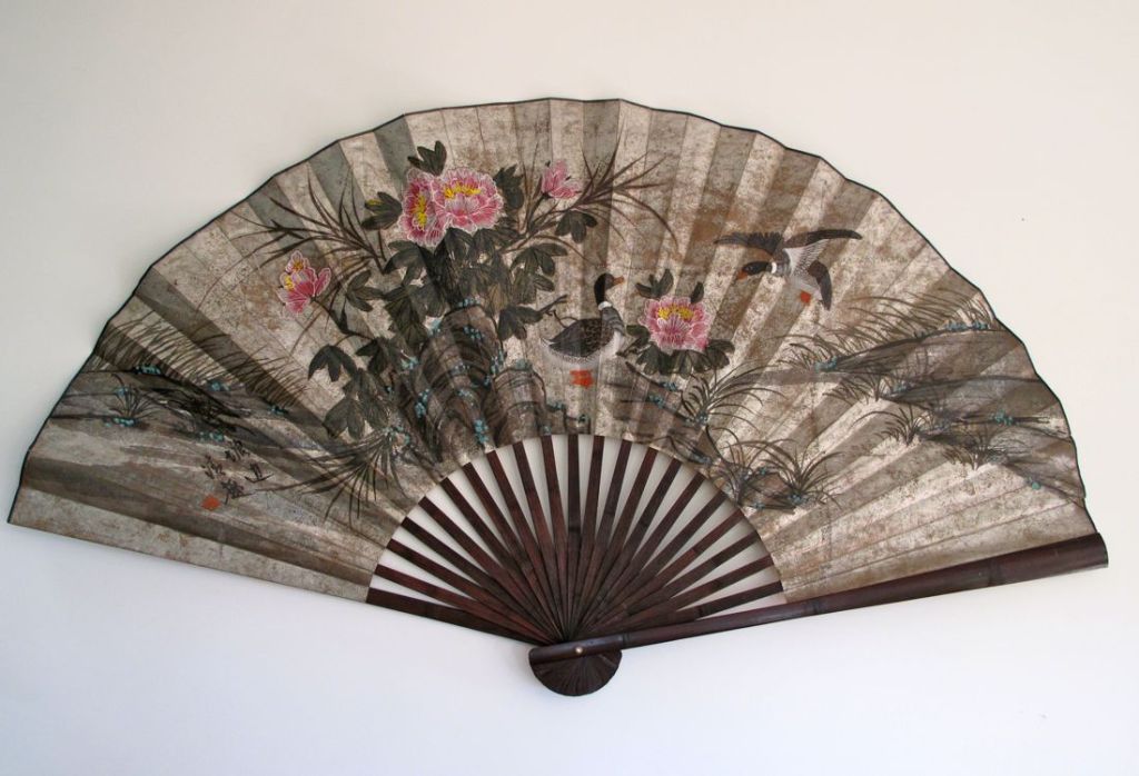 Huge vintage decorative oriental themed folding fan - 160cm across!