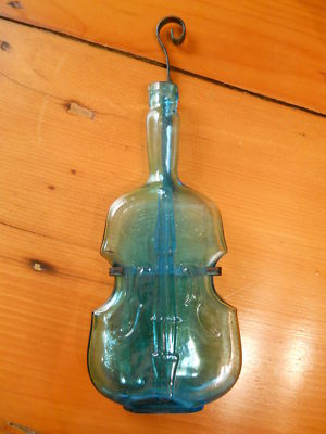 Title (ebay affiliate link): Stunning Antique / Vintage Blown Glass Teal Colored Violin Bottle w/ holder