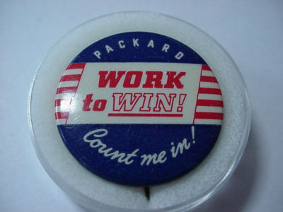 Packard WW2 Work to Win Count Me In patriotic pin 1 1/4" cello exc